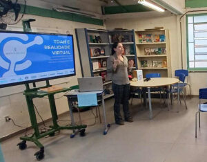 A demonstração do jogo de realidade virtual foi realizada pela pesquisadora Luana Saunders; a reunião aconteceu na Escola Estadual Randolfo Moreira Fernandes, em Indaiatuba