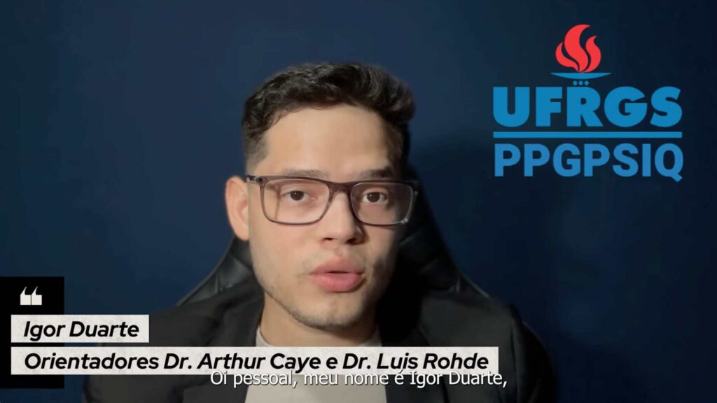 No vídeo, de 2 minutos e 34 segundos, Igor compartilha os resultados da dissertação de mestrado intitulada “Assinatura neurobiológica para o Estado de Risco do Transtorno do Déficit de Atenção e Hiperatividade (TDAH)”. O estudo foi orientado pelos professores Dr. Arthur Caye e Dr. Luis Augusto Rohde, que, no Centro de Pesquisa e Inovação em Saúde Mental (CISM), atuam como gerente de pesquisa e vice-coordenador, respectivamente.