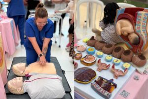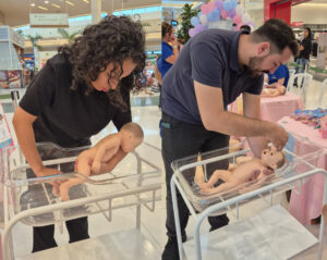 Quatro estandes temáticos foram montados com atividades interativas, incluindo jogos educativos e dinâmicas sobre saúde materno-infantil, manobras de ressuscitação cardiopulmonar e desengasgo, além de práticas de banho e troca de fralda com o uso de bonecos. As profissionais da saúde e estudantes do Centro Universitário Max Planck (UniMAX) ainda passaram orientações sobre amamentação, autocuidado e saúde mental.